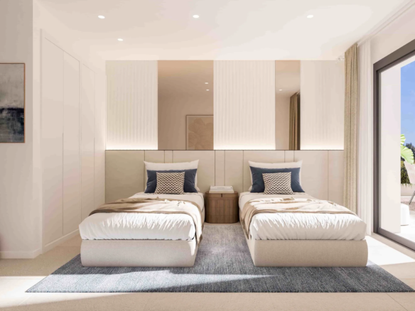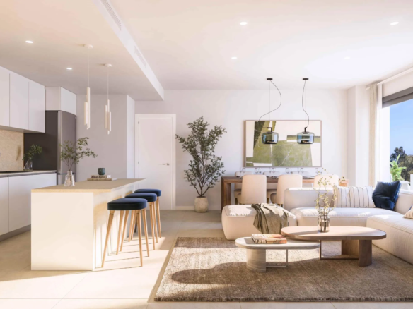Each home offers open-plan living, bright interiors and spacious terraces with panoramic views across the golf course and the sea beyond. With southeast and west orientations, the properties enjoy sunlight throughout the day, creating an inviting sense of wellbeing.
